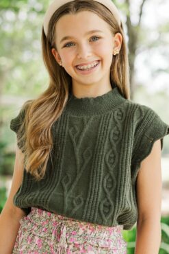 Girls: Get It Going Olive Green Cable Knit Sweater Top