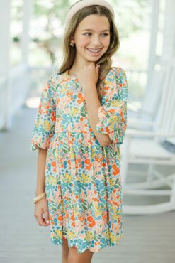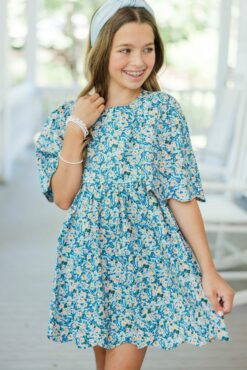 Girls: Right On Time Blue Ditsy Floral Scalloped Dress
