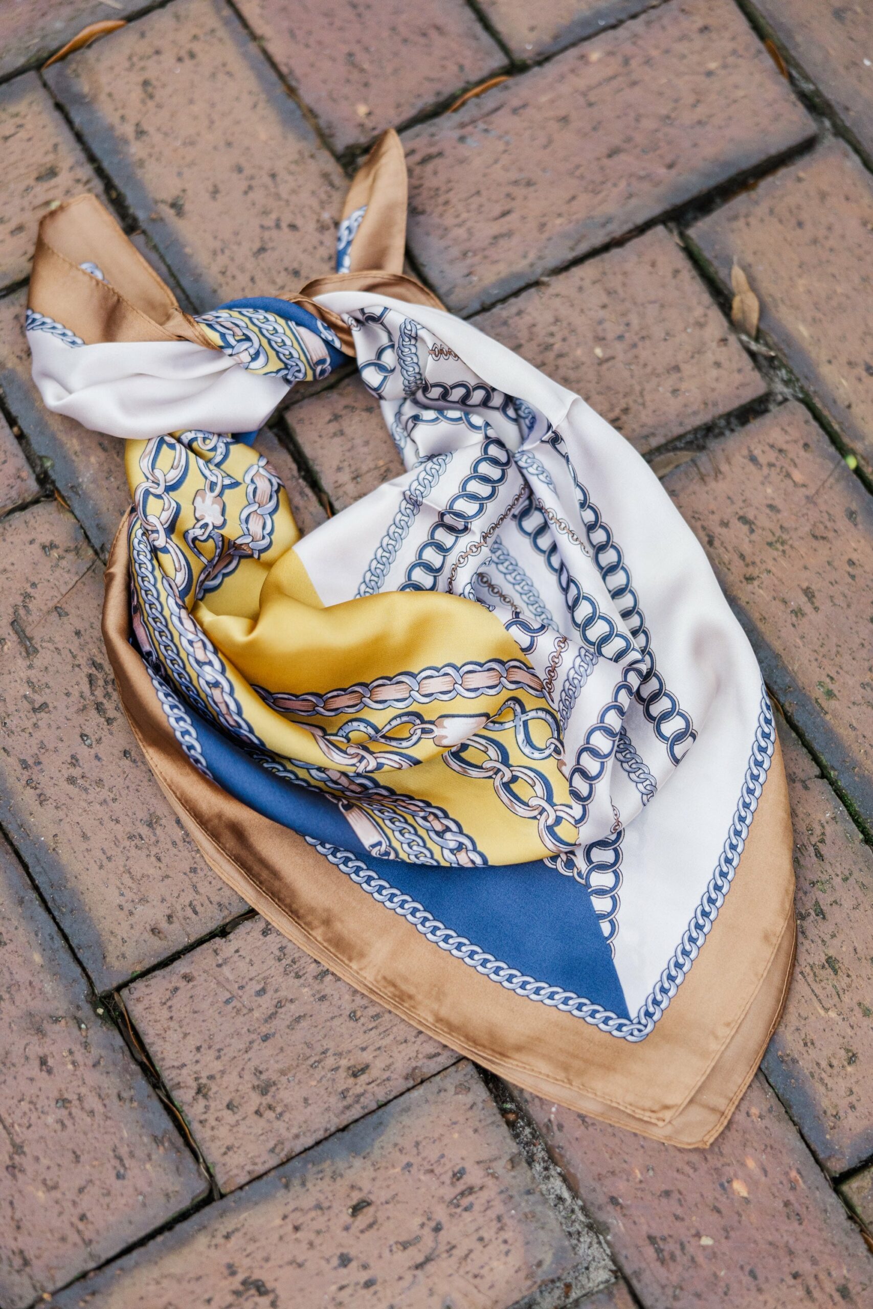 This dual chain print scarf is so trendy! We love that silky fabric and the coloring is perfection for the fall! Plus, we love the versatility of this scarf. You can wear it in your hair, around your neck, tied to your purse, and there are so many ways to incorporate it into your wardrobe.