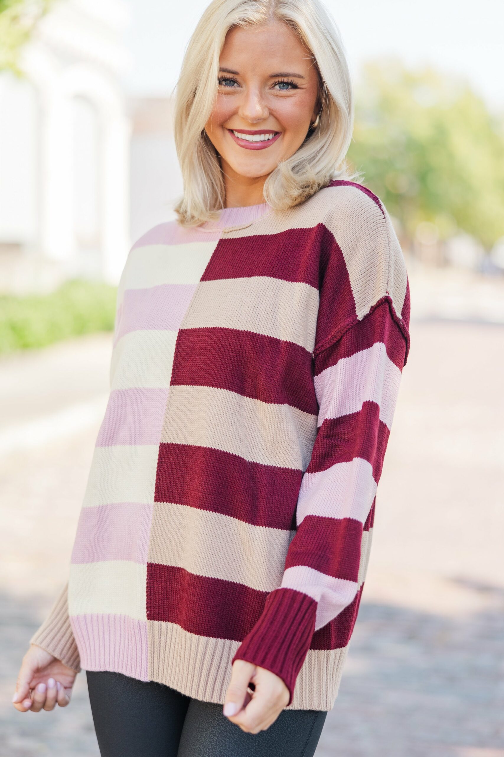 It’s easy to see why everyone loves this sweater! It’s so cute and comfy! This casual sweater is going to style easily for casual day with your fave jeans and sneakers or booties! Round neckline Long sleeves Striped/colorblock print Generous stretch Payton is wearing the small.