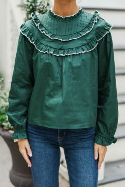 This ruffled blouse is so feminine! The pleated detailing around the neckline and the ruffles are such a fab combination! We love that jewel tone as well! This blouse is going to be perfect for work or weekends! Round neckline Button keyhole back Long sleeves Pleated and ruffled detailing No stretch Baileigh is wearing the small.