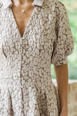 This neutral midi dress is so chic! We are loving that luxe brocade fabric especially when paired with that sassy leopard print! This midi dress is also super flattering with that defined waist! Collared neckline Short bubble sleeves Button down front closure Leopard brocade fabric No stretch Baileigh is wearing the small.