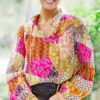 This blouse is all you need to look fab at any fall function! That print is so pretty and those hues look amazing together! This blouse will have you ready for any work day! Smocked mock neckline Button keyhole back Long bubble sleeves Damask print No stretch Baileigh is wearing the small.