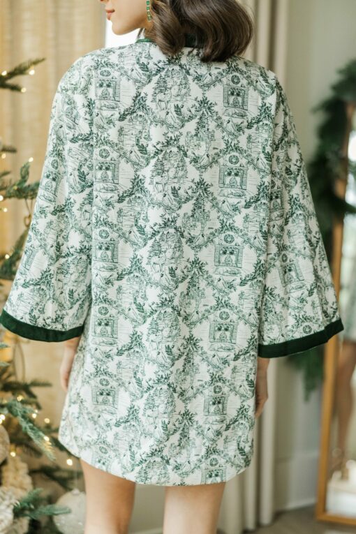 This dress is going to fulfil all of your wishes! That holiday themed toile print is so cute and we love that velvet trim! Anytime we get to mix textures is a good thing! V-neckline 3/4 sleeves Velvet trim Holiday toile print No stretch Savannah is wearing the small.