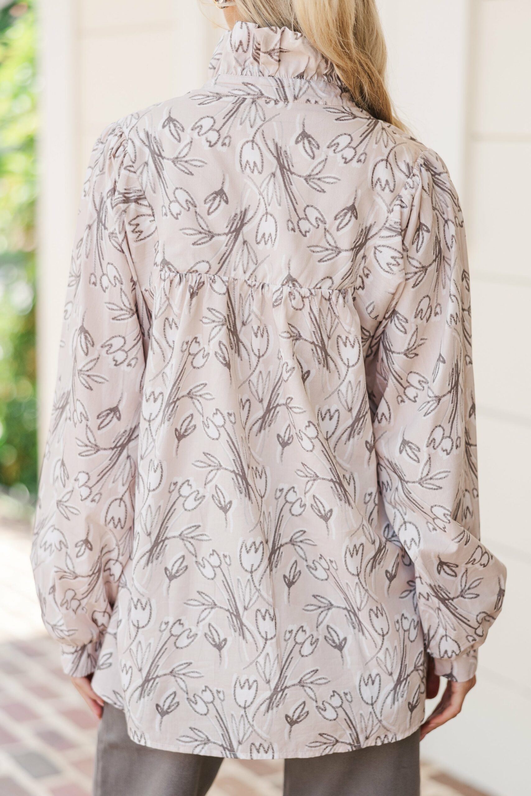 This neutral blouse is a real stunner! That floral print is so chic and we love that classic fit. This blouse is going to style so well for work with trouser but also with jeans on the weekends! Stand up collared v-neckline Long sleeves Babydoll cut Floral print No stretch Baileigh is wearing the small.
