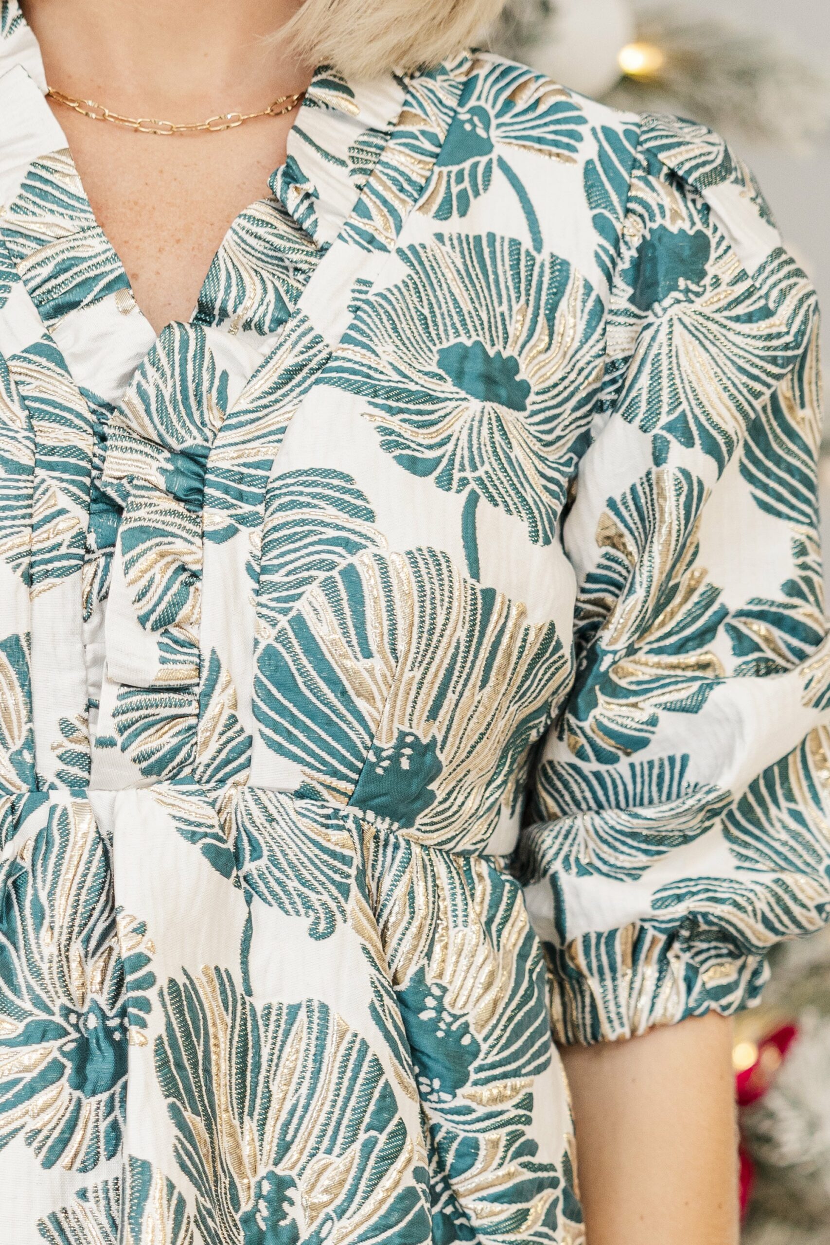 As it happens, this dress is sure to be a holiday stunner! That print and fabric are so gorgeous and luxurious together! This dress is going to be an easy choice for any holiday party! V-neckline Short puff sleeves Floral brocade fabric No stretch Payton is wearing the small.