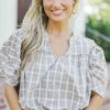 At a glance, we really like this dress! But on closer inspection, we love it! That hue is perfect for the holidays and we couldn’t love that textured fabric more! V-neckline Long puff sleeves Textured fabric No stretch Savannah is wearing the small.