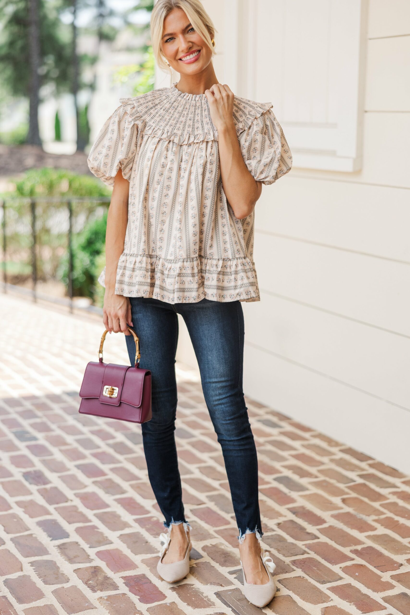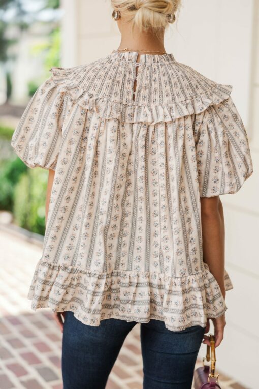 This ditsy floral blouse is so feminine and everyone is sure to remember is well! That babydoll cut and those puff sleeves are so trendy and we love the neutral hues. This blouse is perfect for any occasion! Round neckline Button keyhole back Short puff sleeves Ruffled detailing Ditsy floral print Babydoll cut No stretch Baileigh is wearing the small.