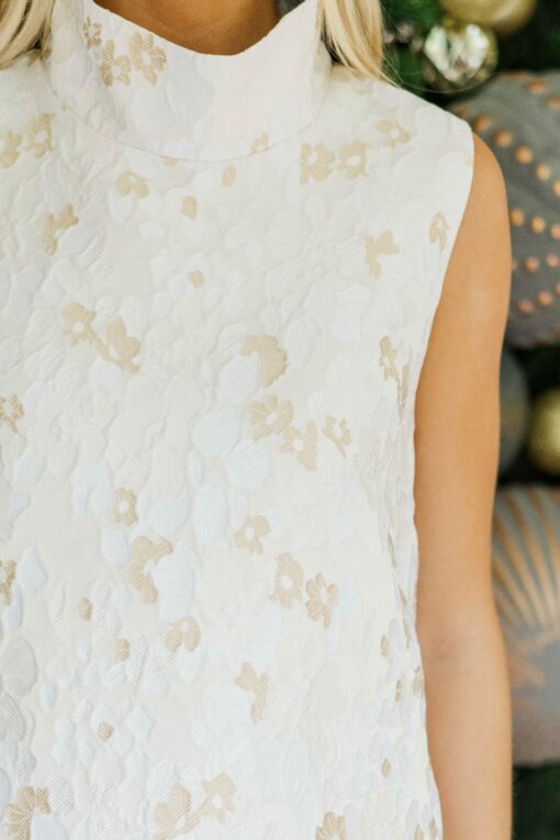 Your best days are ahead if you have this dress at your finger tips! This brocade beauty is sure to light up any room! That neutral floral color palette also makes styling a breeze! High mock neckline Button back closure Sleeveless Pockets Floral brocade fabric No stretch Baileigh is wearing the small.