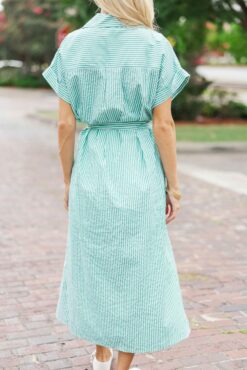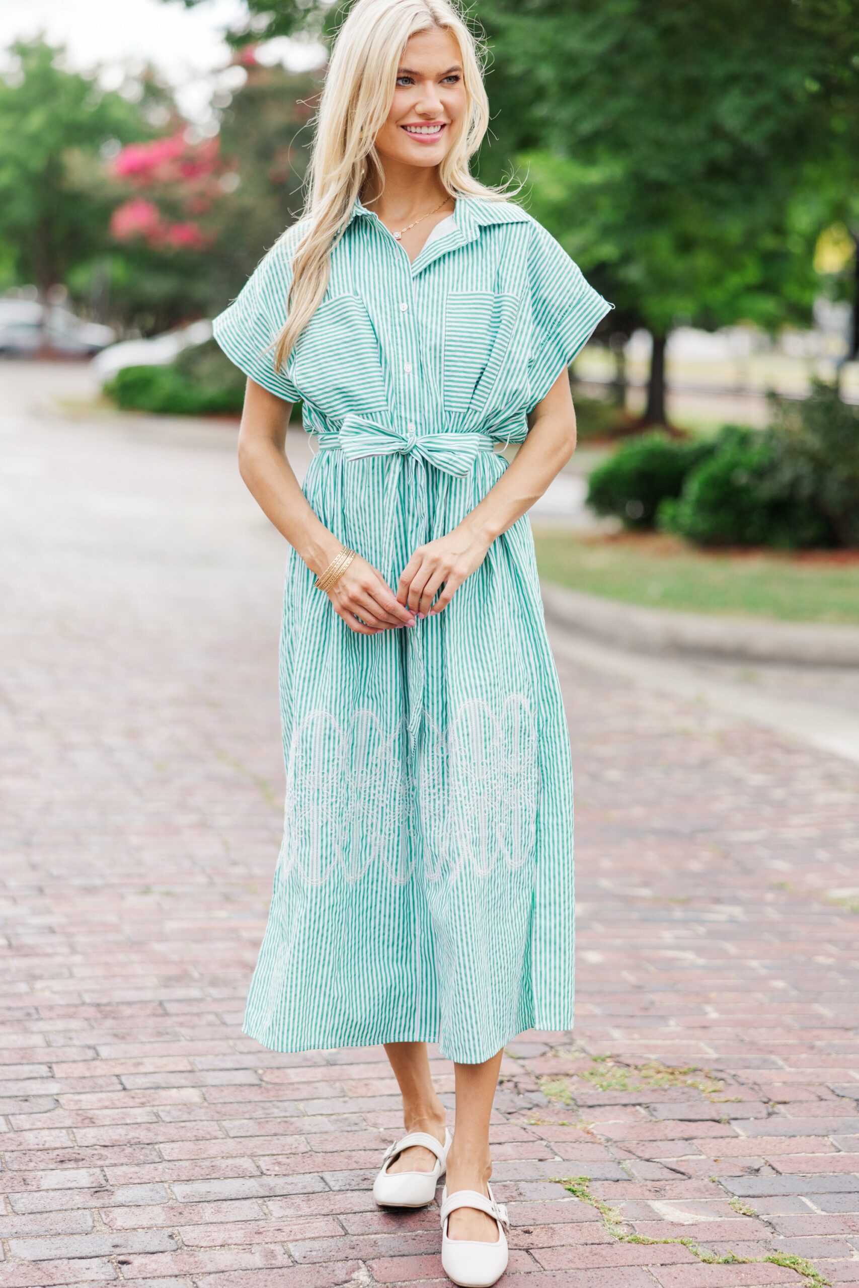 This button down dress is the definition of classic and chic! We love the striped print and the bright green hue! Plus, this dress has some stunning embroidery around the bottom. Collared neckline Button down front closure Short sleeves Striped print Embroidery No stretch Baileigh is wearing the small.