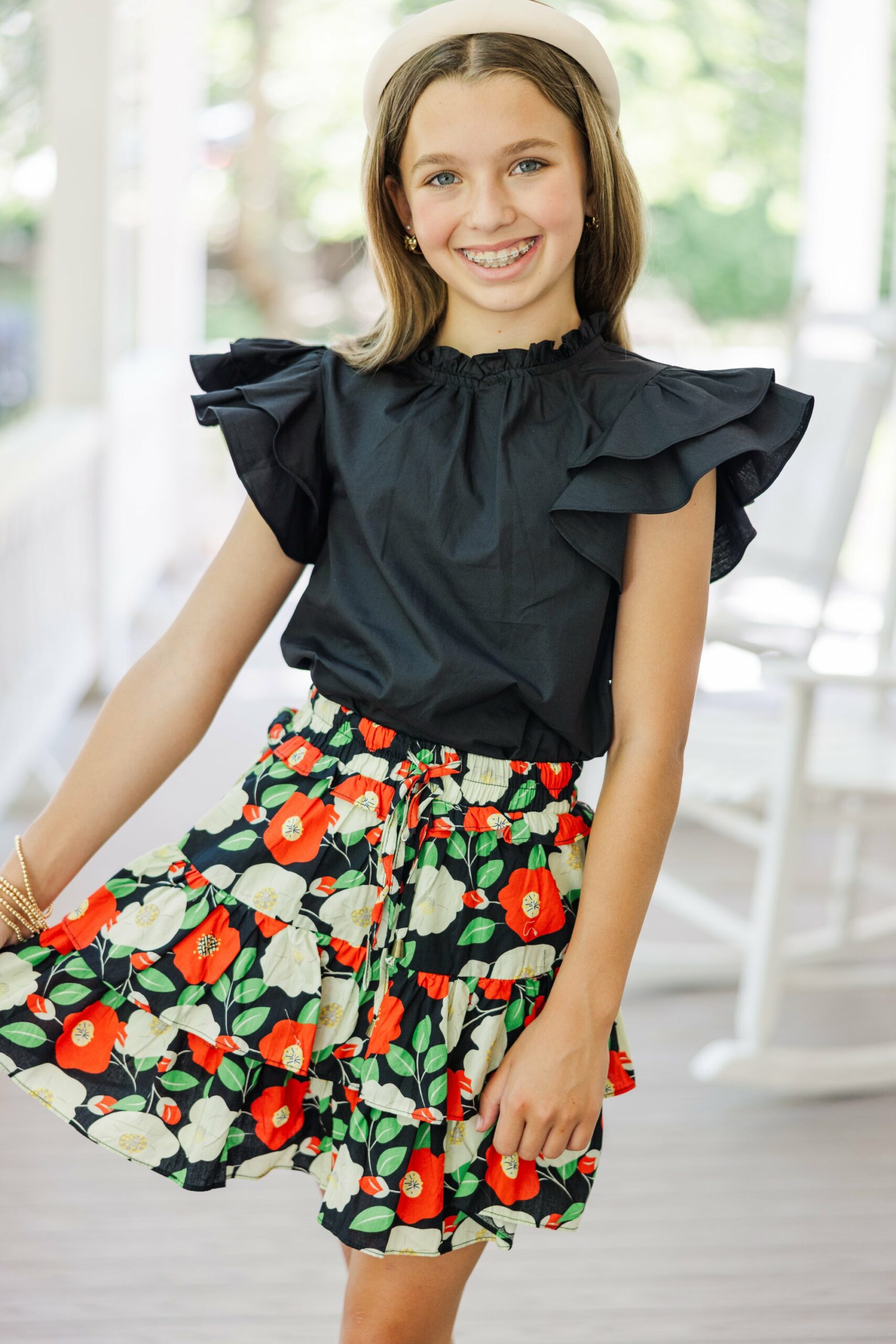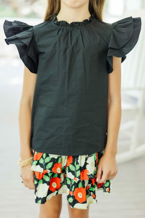 This blouse is just precious for your tween! The solid coloring makes it so easy to style and also makes it perfect for year round wear. The little ruffled detailing around the neckline and sleeves are so girly and cute! Round neckline Short ruffled sleeves Button keyhole back No stretch Morgan is wearing the small.