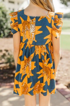 This dress will surely make your tween a standout at your tailgate! This boldly printed dress is so much fun! This dress is going to be such an easy go to for football season! Round neckline Zip back closure Short sleeves Star/tiger print Babydoll cut No stretch Morgan is wearing the small.