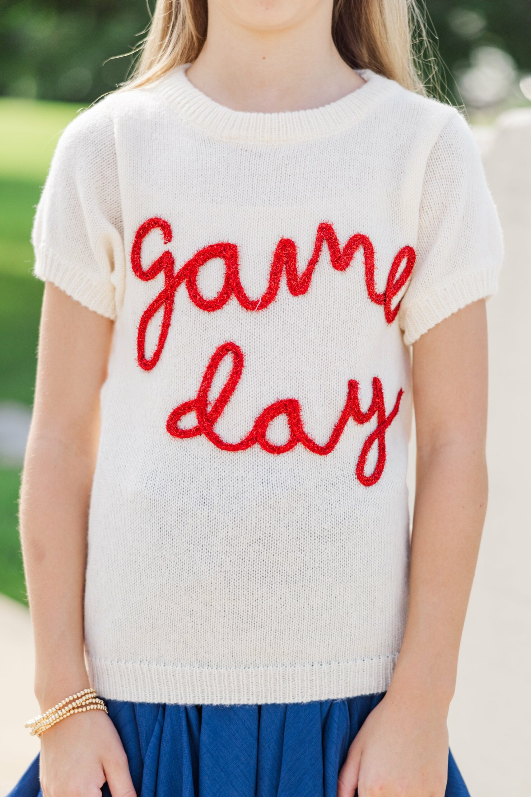 Like the sweater says, it’s gameday! Making this fun sweater a must have this fall in your girls wardrobe! We love that it’s a short sleeve sweater too since they are right on trend! But the adorable puff sleeves and that metallic lettering are the real winners here! Round neckline Short puff sleeves Metallic lettering Generous stretch Morgan is wearing the small.