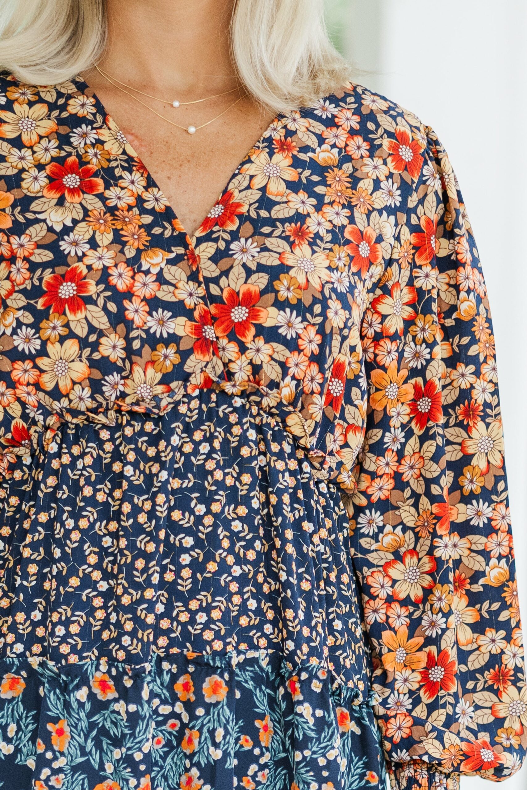 This midi dress is a real winner! That floral combination and those rich fall colors are perfect together! This midi dress will also look great at work, attending a wedding, or going on a date night. V-neckline Long sleeves Dual ditsy floral prints No stretch Payton is wearing the small.