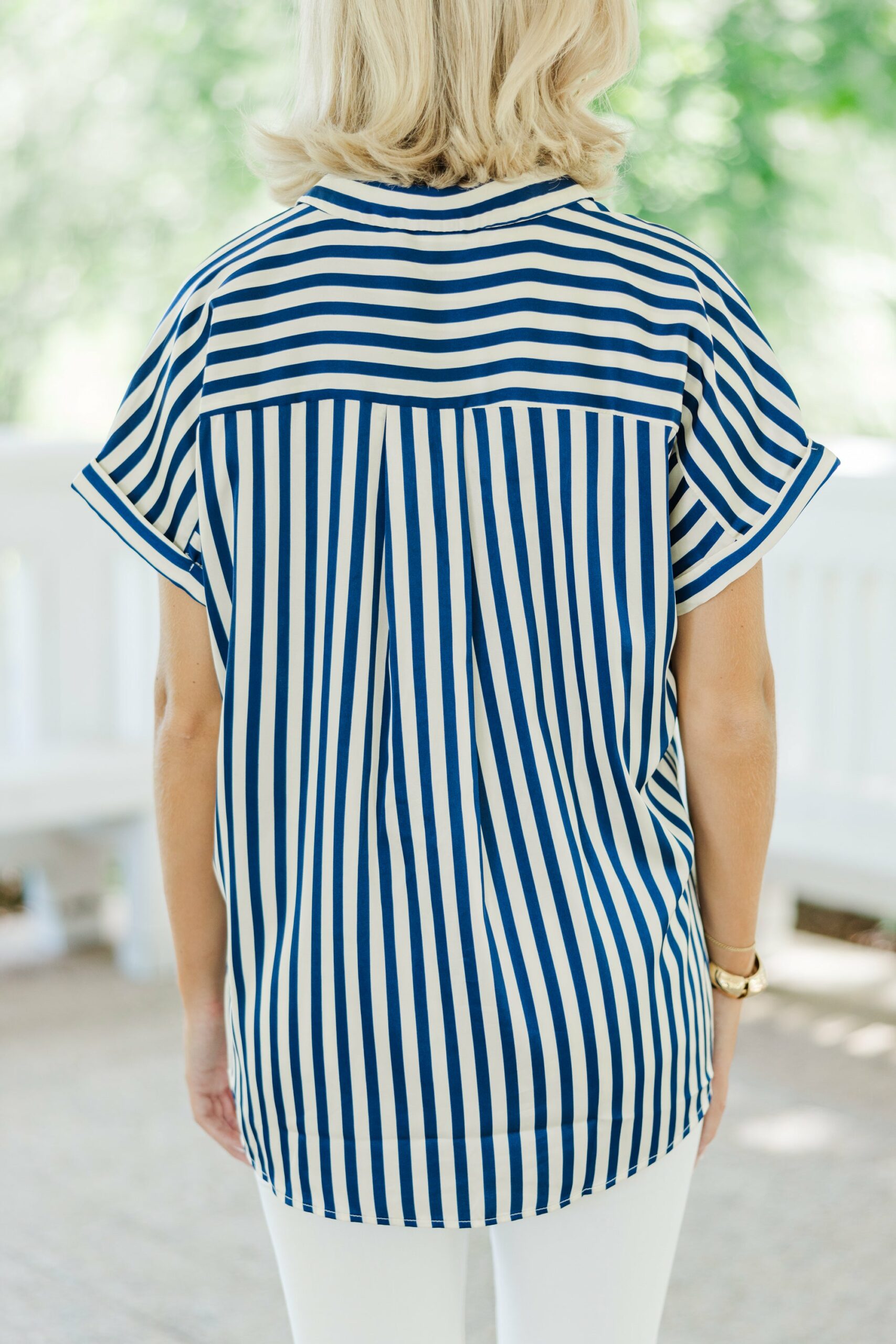Let us help you out. This blouse is a staple and you will be beyond happy you have it all summer long! That striped print and that classic fit are perfect together! Collared neckline Button down front closure Short sleeves Striped print No stretch Payton is wearing the small.