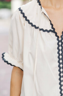 This blouse will have you feeling like you are living in a dream! That neutral coloring is so chic and we love that trendy rickrack trim. This blouse is going to be the perfect addition to your workwear wardrobe! V-neckline Short sleeves Rickrack trim No stretch Baileigh is wearing the small.