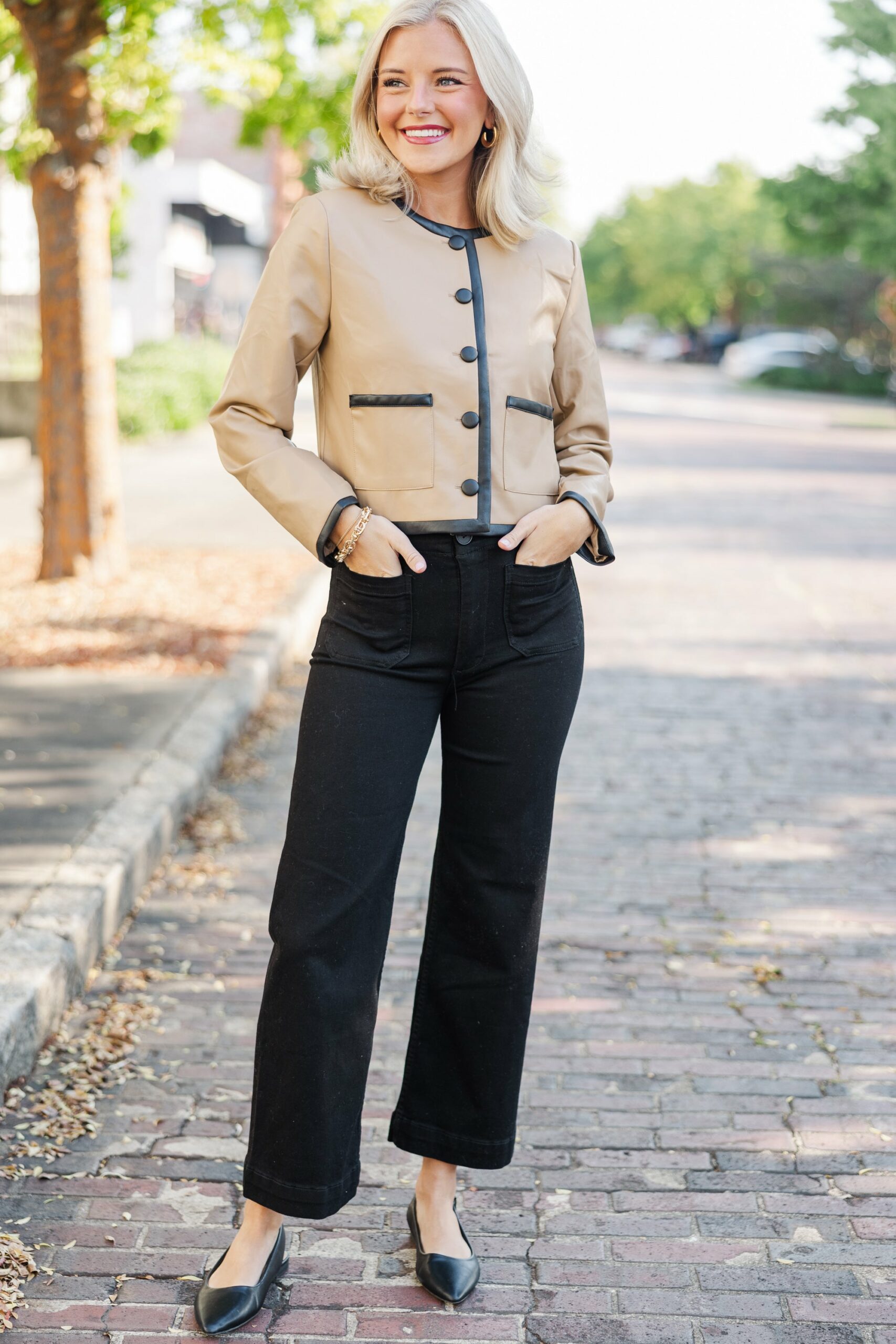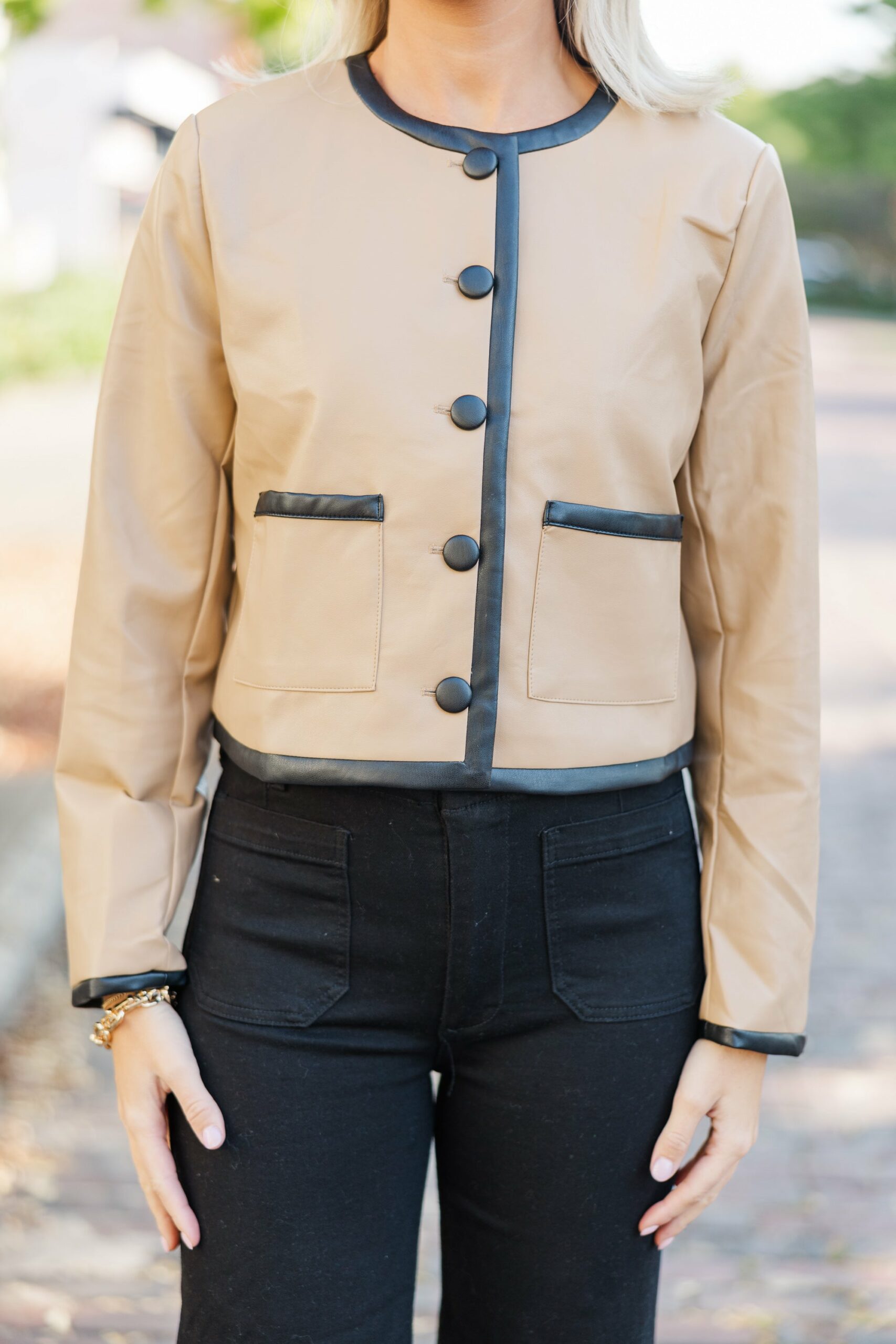 This faux leather jacket couldn’t be more chic or luxe! It’s perfect for the fall. This jacket is going to look great for days at the office, meetings, interviews, or even a nice dinner. Round neckline Button down front closure Long sleeves No stretch Payton is wearing the small.