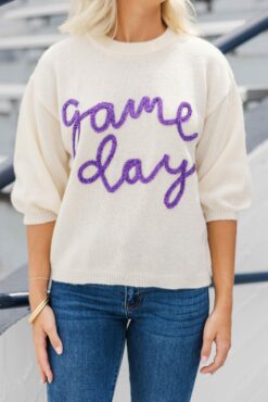 Like the sweater says, it’s gameday! Making this fun sweater a must have this fall! We are loving the slightly cropped hemline that makes it great for high waisted jeans! But the adorable puff sleeves and that metallic lettering are the real winner here! Round neckline 3/4 puff sleeves Metallic lettering Generous stretch Payton is wearing the small.