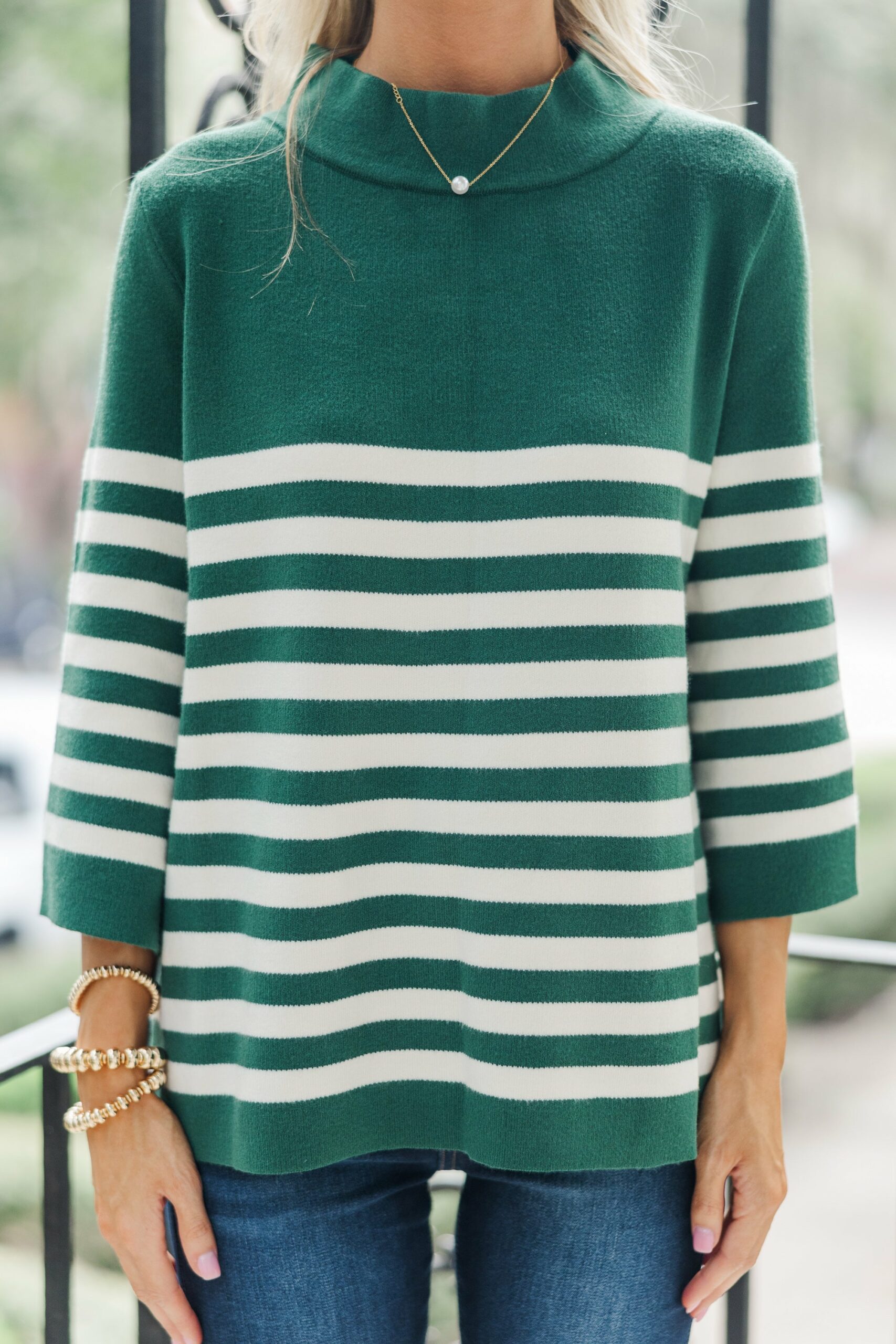 We have the strongest feeling that you are going to adore this sweater! That color is perfect for the fall and we love the classically striped print. This mock neck sweater is going to look great with your favorite jeans! Mock neckline 3/4 sleeves Striped print Generous stretch Baileigh is wearing the small.