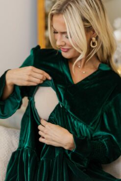 This dress is so cute and, better yet, functional! We love that flowy tiered body and that easy access zipper under the bust. Plus, we love that you can style this dress with heels, boots, or sneaker for any occasion! V-neckline Hidden zipper under the bust that can unzip all the way across from either side 3/4 flounce sleeves Tiered body Velvet fabric Minimal stretch Baileigh is wearing the small.
