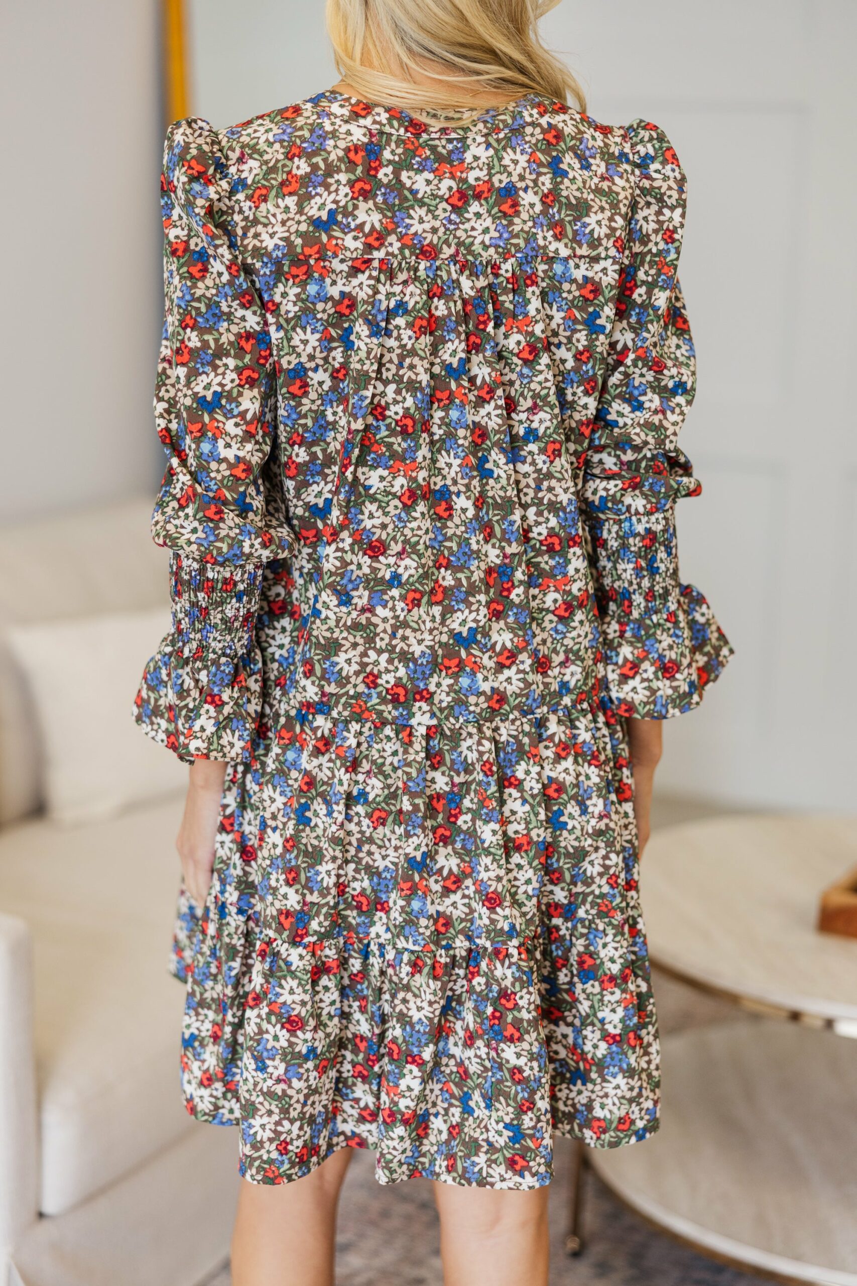 This dress is so cute and, better yet, functional! We love that flowy tiered body and that easy access zipper under the bust. Plus, we love that you can style this dress with heels, boots, or sneaker for any occasion! V-neckline Hidden zipper under the bust that can unzip all the way across from either side 3/4 flounce sleeves Tiered body Ditsy floral print No stretch Baileigh is wearing the small.