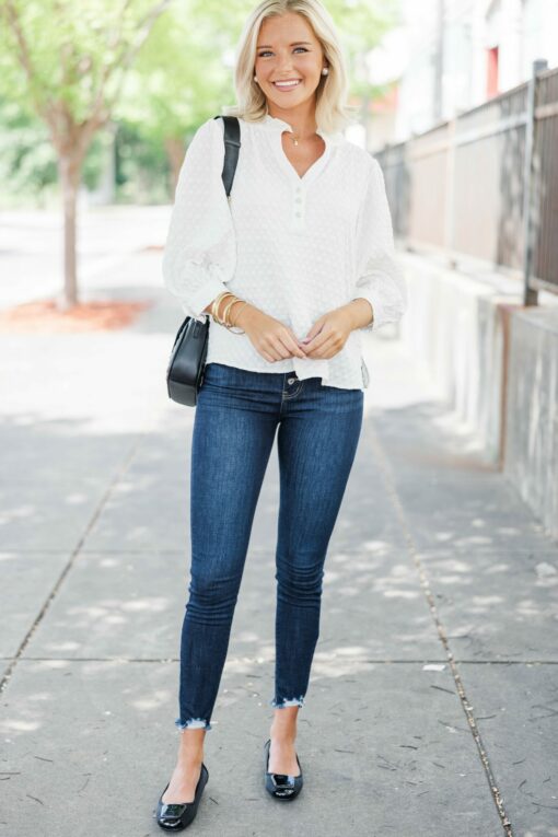 This textured blouse is so chic and classy. It is going to make getting ready for a day at the office a breeze! It will also look great with jeans for lunch! Partial button down v-neckline 3/4 sleeves Textured fabric No stretch Payton is wearing the small.