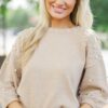 This short sleeve sweater will have you ready for any fall day! This style is so trendy and we love the hues! The pink striped are so cute paired with that olive green! This short sleeve sweater is going to look great with high waisted jeans or the matching knit joggers we have available! Round neckline Short sleeves Striped print Generous stretch Baileigh is wearing the small.