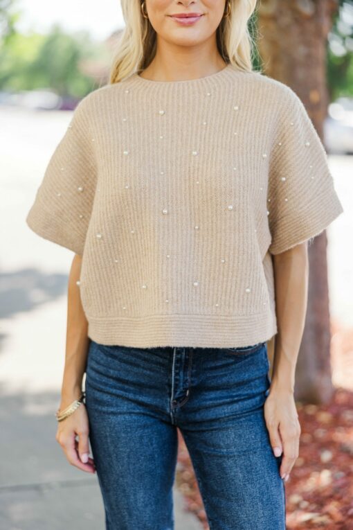 We know you’ll be seeing this short sleeve sweater soon! It’s just too cute! We love a good neutral and those pearl embellishments are so chic! This short sleeve sweater is going to look great from now through fall! Round neckline Short sleeves Ribbed knit fabric Pearl embellishments Generous stretch Baileigh is wearing the small.